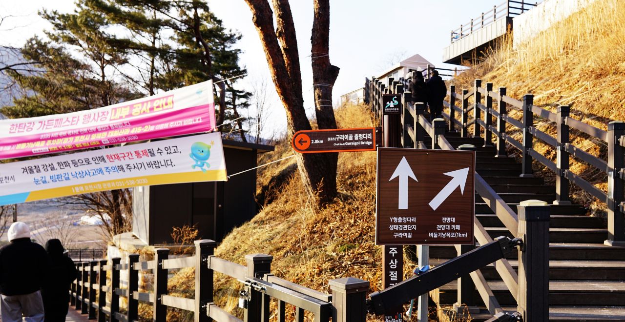 | 도보여행: 주상절리길 8코스 이어서 6코스<<1기갑여단(정류장) - 부소천교 - 벼룻교 - 멍우리협곡탐방안내소 - 전망대 - 낙석위험지역 - 대화산교 - 하늘다리 - 풀로팅데크로드(가람길) - 전망대폭포 - 비둘기낭폭포 - Y형 출렁다리 - 가람누리전망대 - 6코스 스탬프함 - 영로대교 - 구라이골출렁다리 - 광산골(정류장)>> 합 16.2km 하이라이트: 하늘다리, 풀로팅데크로드, Y형출렁다리, 구라이골 출렁다리, 교통편: 1386번 버스(도봉산역 ~ 1기갑여단), 100번 버스(광산골 ~ 포천시청), 1386번 버스(포천시청 ~ 도봉산역) 주의사항: 언땅, 결빙, 낙석주의, |