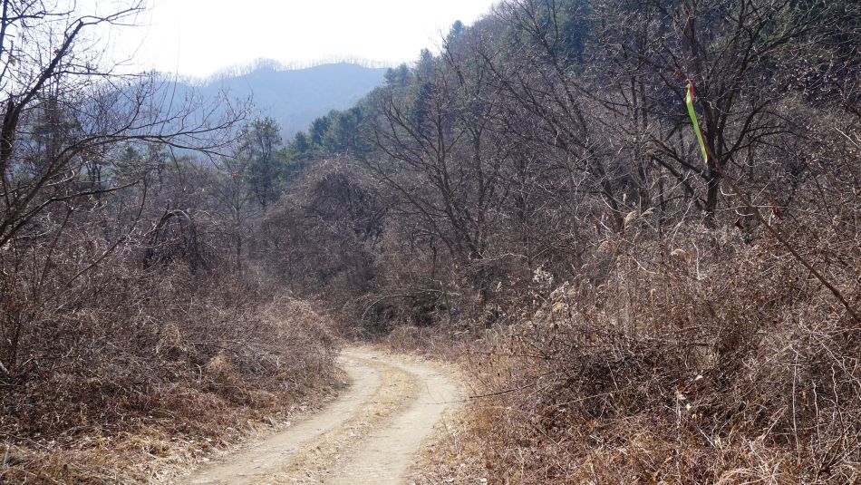 무슨 공사인지 주변이 다 파헤쳐져 있습니다. 코스 안내 리본은 왼쪽으로 가도록 매어져 있지만 다 뭉개져 있어 가다가 길이 실종, 원위치로 되돌아나와 우측 테이프줄이 걸쳐져 있는 새로 조성한 듯한 오르막길로 올라갑니다.