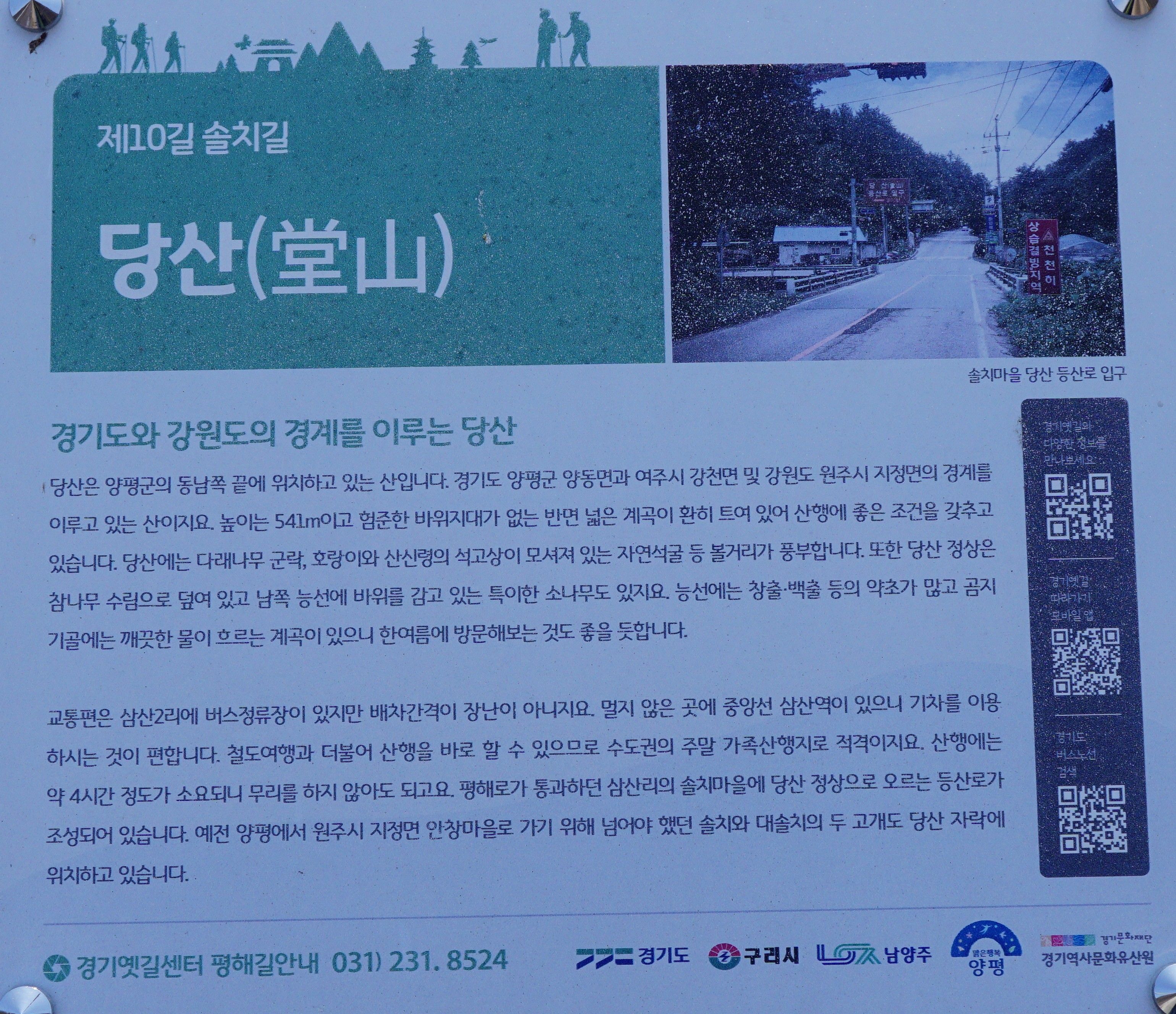| 도보여행: 경기둘레길 31코스 물길 들길 산길 (쌍학리 - 삼산리 - 도전리)<<양동역 - 하나로마트 - 석곡천(쌍학교 - 검단다리 - 은행나무 - 배내교) - 삼산역길 - 경기옛길 스탬프 - 솔치길(삼산교 - 캠핑장 - 임도 - 공사현장 - 곰지기고개) - 하산길(양묘장 - 사방댐) - 원심동길 - 도전공소 - 원양1로(도전3리마을회관 - 반디카페 - 오토캠핑장 - 도전분교장 - 도전2리정류장 - 31코스 스탬프) - 장수폭포>> 14.2km, 하이라이트: 삼산리 500년 은행나무, 도전공소, 장수폭포, 교통편: ITX마음열차(용문역 ~ 양동역), 130번 버스(도전2리정류장 ~ 여주역) 유의사항: 교통불편(도전리에서 오후 4시 35분 130번 버스를 놓치면 다음은 20:00입니다) |
