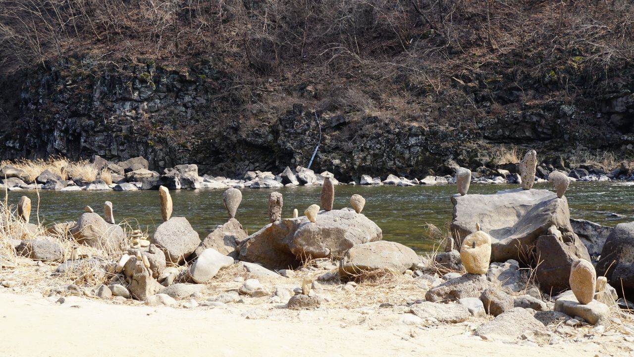 양수장 앞에 누군가가 정성 들여 정교하게 거꾸로 세워놓은 예쁜 돌들, 바람이 세게 불거나 물이 넘쳐흐르면 쓰러지겠죠.