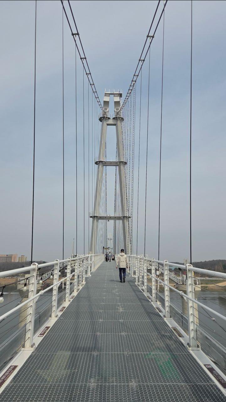 많은 사람들이 오고 가고 있는 출렁다리, 슬림형이어서 출렁임이 상당하지 않을까 싶었지만 보통입니다. 강물바닥이 훤히 보이는 벌집형 강판도 엷은 단층판으로 시공되었네요. 다른 곳의 두툼한 출렁다리에 비하면 놀라울 정도로 얇은데요. 새로운 공법으로 보입니다. 강물에 모터보트, 수상스키는 벌써 제철을 만난 듯하네요.