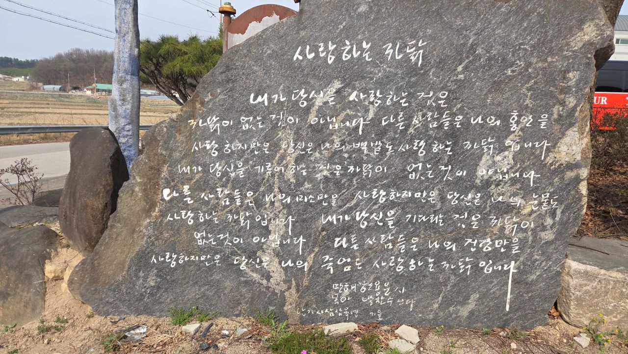 목아박물관 주차장 앞 바위에 새겨놓은 한용운의 시 '사랑하는 까닭', 목아 박찬수의 글씨입니다.