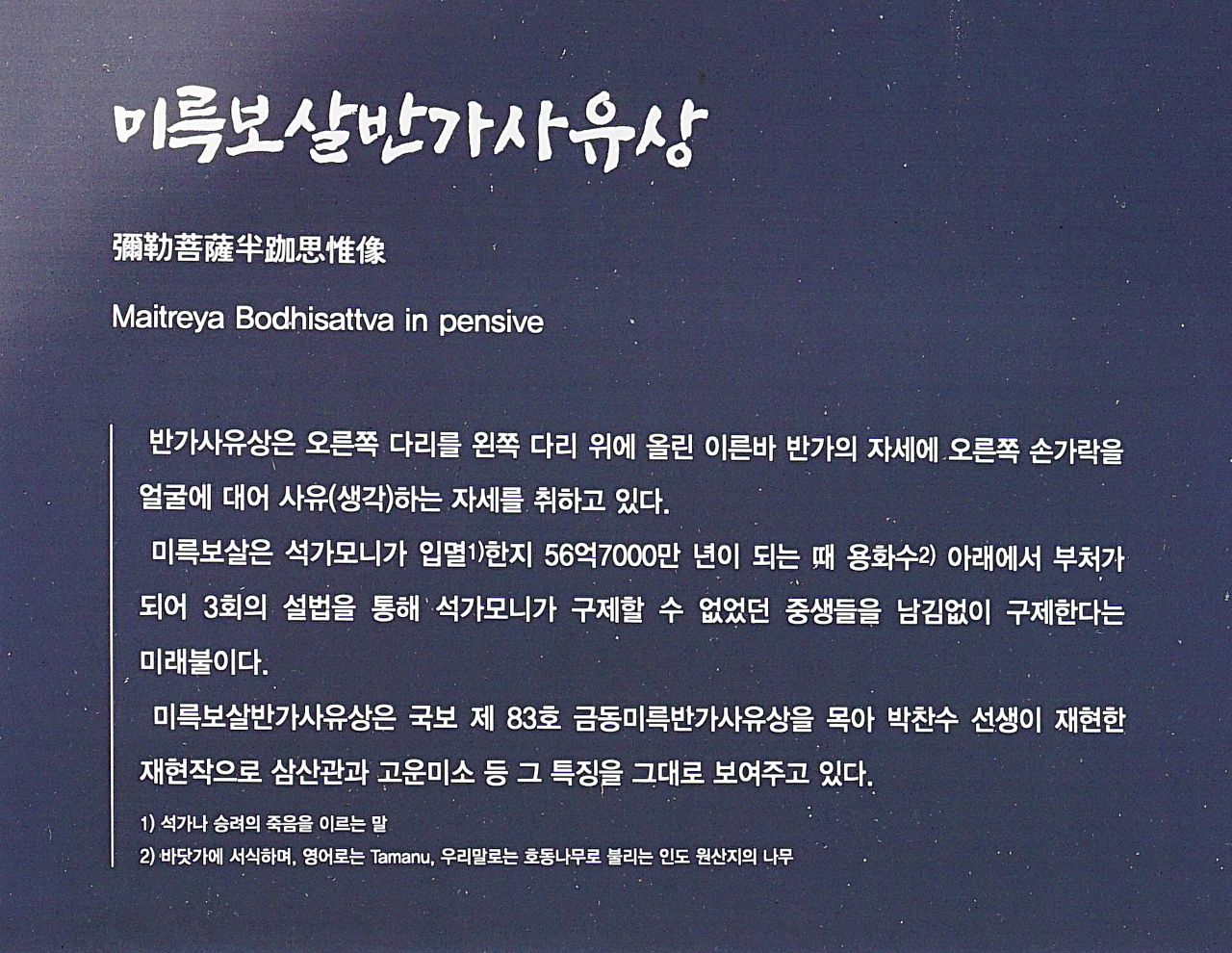 미륵보살반가사유상은 국보 83호 금동미륵반가사유상을 박찬수 장인이 고운 미소 그대로를 호동나무로 재현한 재현작입니다.