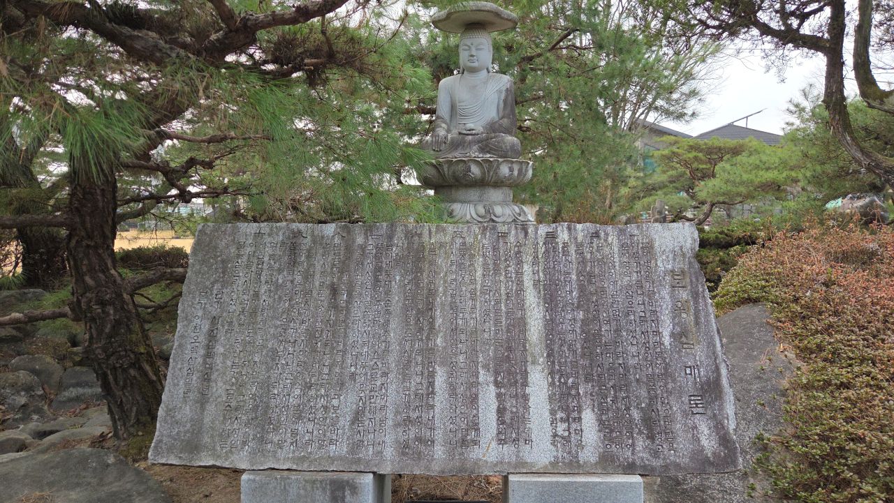 입장, 들어서면서 가장 먼저 눈에 들어오는 장승보다도 더 커 보이는 석존불, 1993년 6월 목아불교박물관으로 개관하면서 개관 기념행사로 봉안식이 거행된 석조미륵삼존불입니다. 목아 박찬수 장인의 작품으로 30센티 정도의 목각작품을 먼저 만들고 화강암을 같은 비율로 조각, 크게 만든 대형작품 대표작입니다.