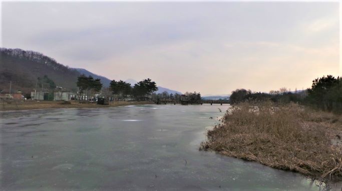 강안천 찬물에 노니는 고니 떼, 멀리 광동교,