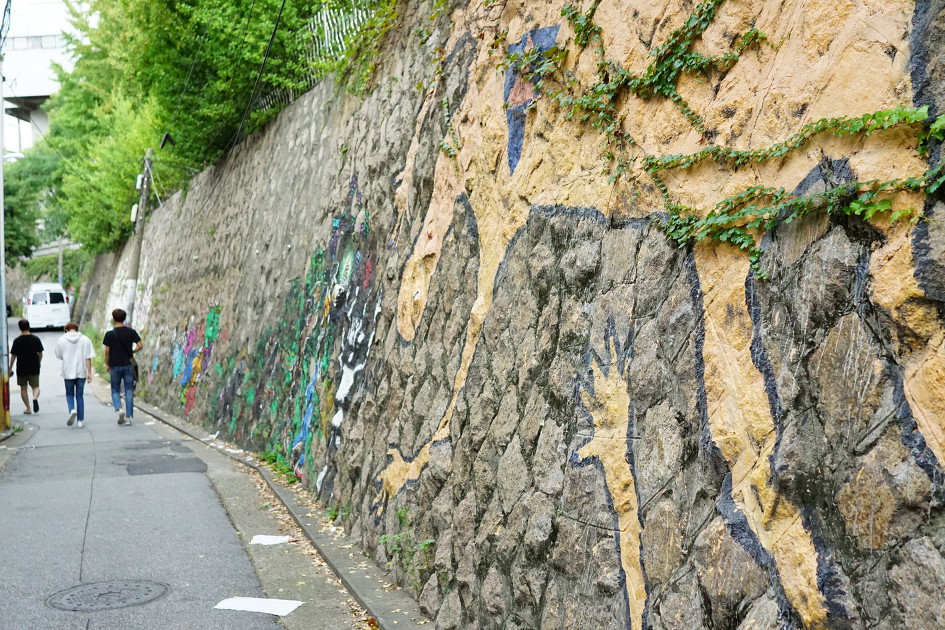 돌담벽화길은 여기서 끝나고, 오른쪽으로 돌아나가면 홍대 정문입니다.