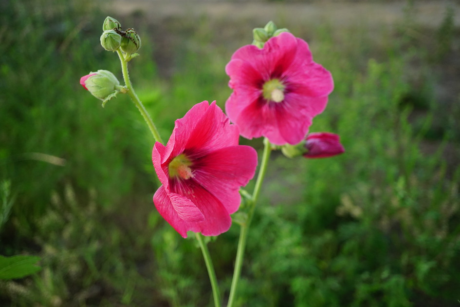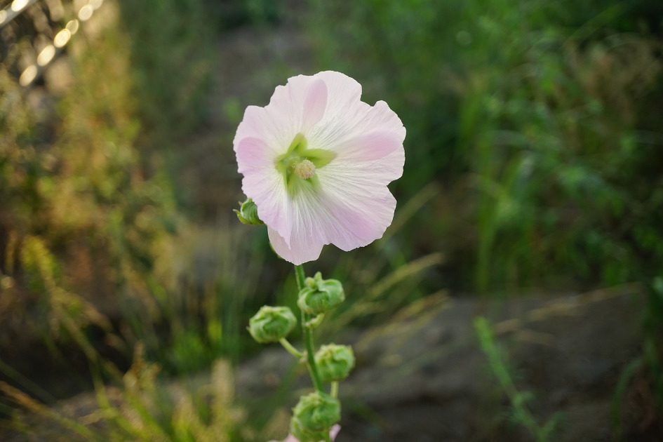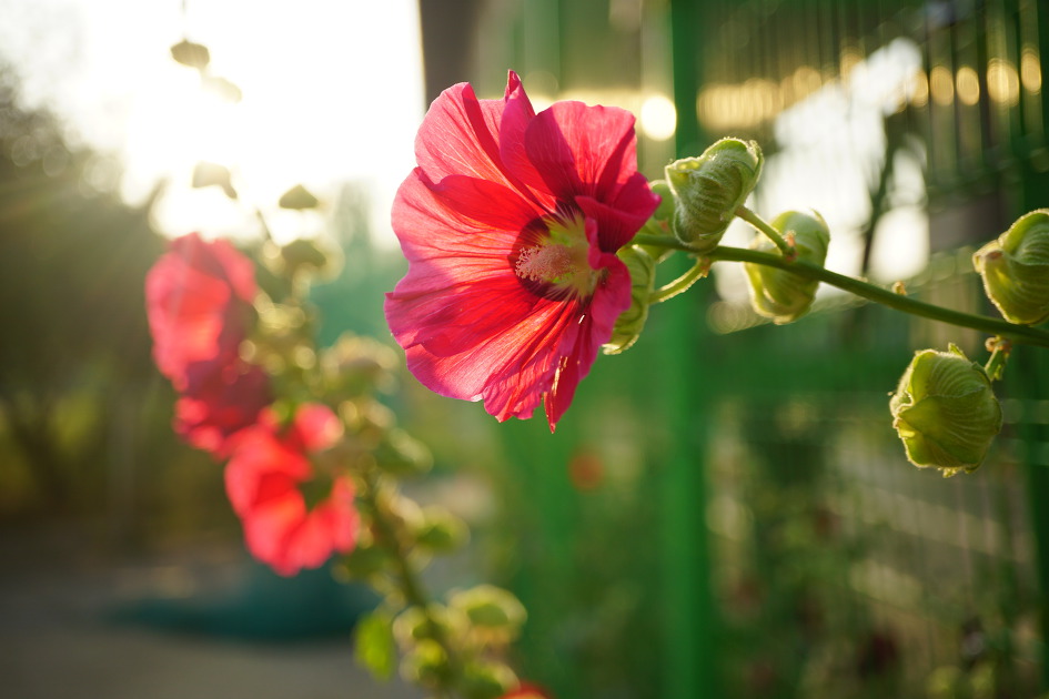 접시꽃 하면 '접시꽃 당신'이라는 시가 먼저 떠 오르죠. 그럴 만큼 그 시로 인하여 먼저 세상을 떠난 아내에 대한 사랑과 그리움으로 꽃의 이미지가 완성되었다고 할 수 있겠습니다. 한마디로 당신이라고 불러서 어울릴 수 있는 여인, 아내 또는 아낙의 이미지가 아닐까 싶어요. 그런 접시꽃이 어울리는 장소는 시골집 뜨락, 담벼락, 시골길, 시골학교 교정들이 우선 떠오르죠. 요즘엔 많이 심어서 그렇겠지만 강변 둔치에서 많이 볼 수 있습니다. 강변에 접시꽃이 너무 많이 한데 어울려 피어있으니 뜨락에 몇 송이 피어 있을 때 보이는 다소곳한 이미지는 숨어들고 키 큰 씩씩한 아낙들이 우르르 몰려 있는 그런 이미지로 보이기도 합니다. 중랑천과 청계천이 합수되는 살곶이공원에서 마장교 사이, 자전거 길가에 키 큰 접시꽃이 몰려 있네요. 붉은 꽃들이 훨씬 많은데 사이사이에 하얀 접시꽃이 끼어 저무는 햇빛의 역광을 받아 더 눈부시고 하얗게 투영되고 있습니다. 꽃이 접시만큼이나 커서 접시꽃이라 하는가 했는데 씨앗이 접시모양으로 똑 닮아서 접시꽃이라 하는군요. 꽃말은 열렬한 사랑, 잘 어울리는 꽃말입니다.