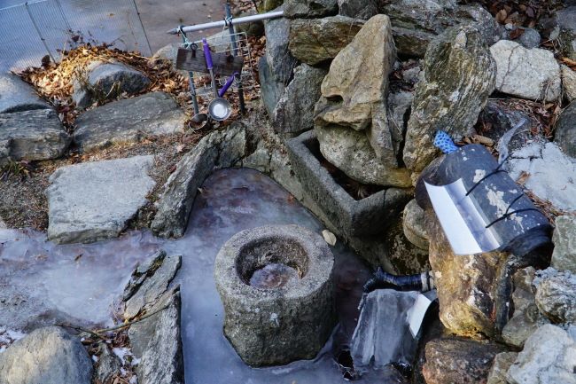 연못 앞, 샘물도 얼어 있고..