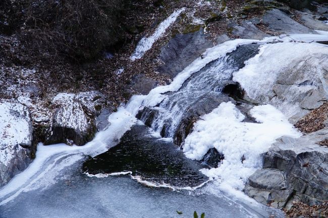 계곡을 따라 힘겹게 오르막길을 올라갑니다. 응달진 계곡은 꽁꽁 얼어 있습니다.
