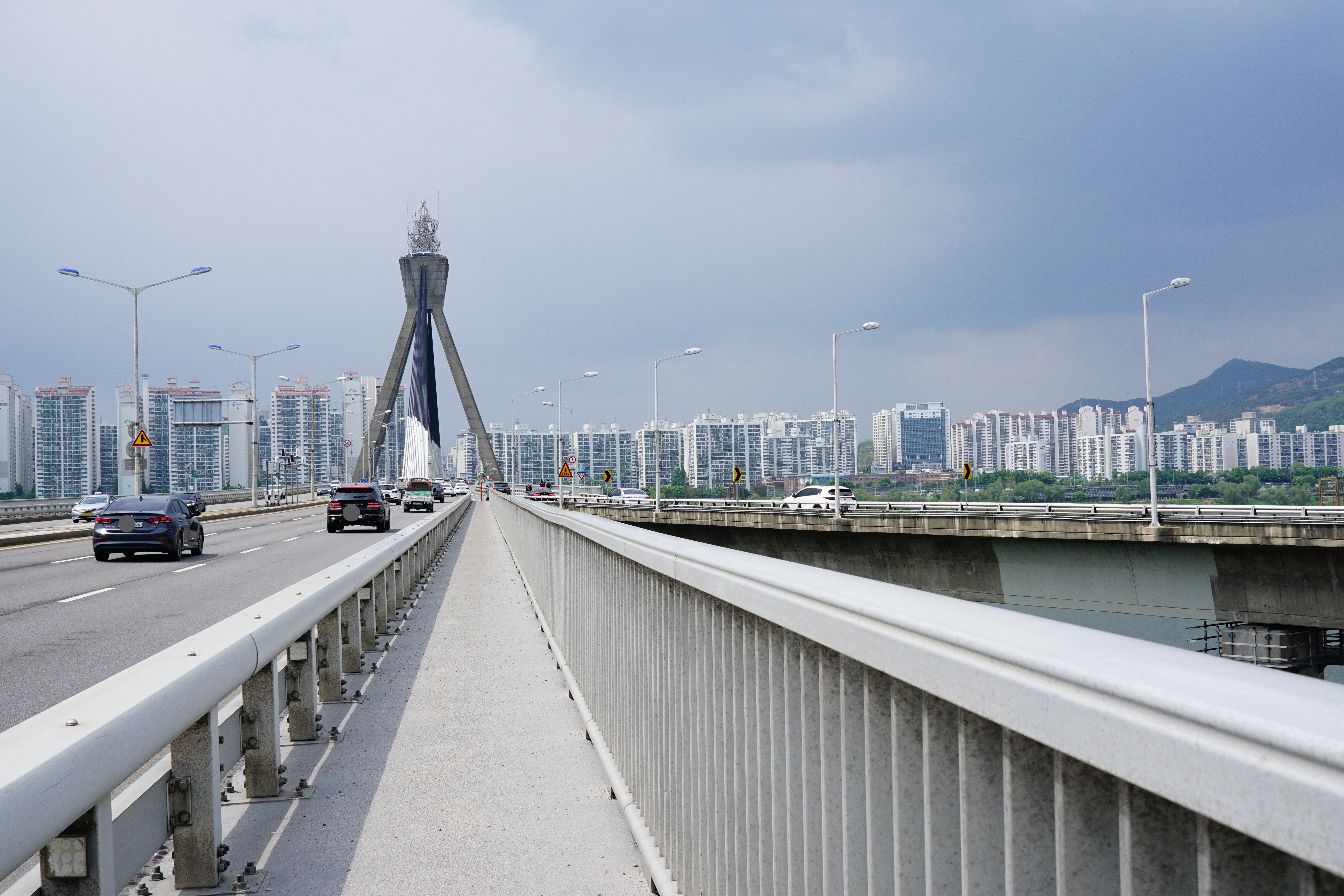 올림픽 대교 갓길엔 자전거 탑승금지입니다. 꾸물거리기만 하고 안 올 것 같던 비가 올림픽대교를 건너가면서 소나기가 쏟아지기 시작했습니다.