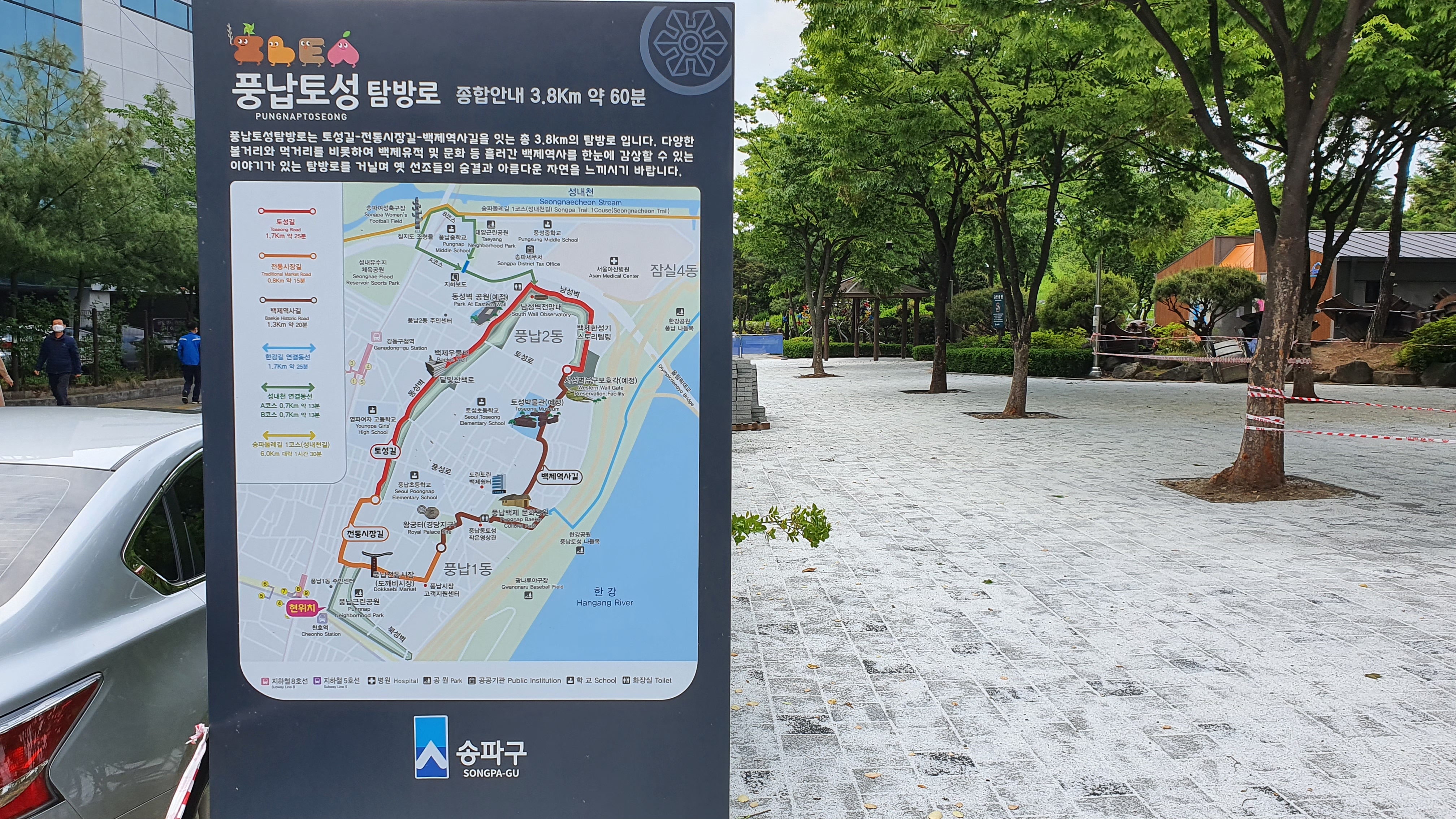 그 조형물 앞에 풍납토성 탐방로 안내판이 세워져 있습니다.