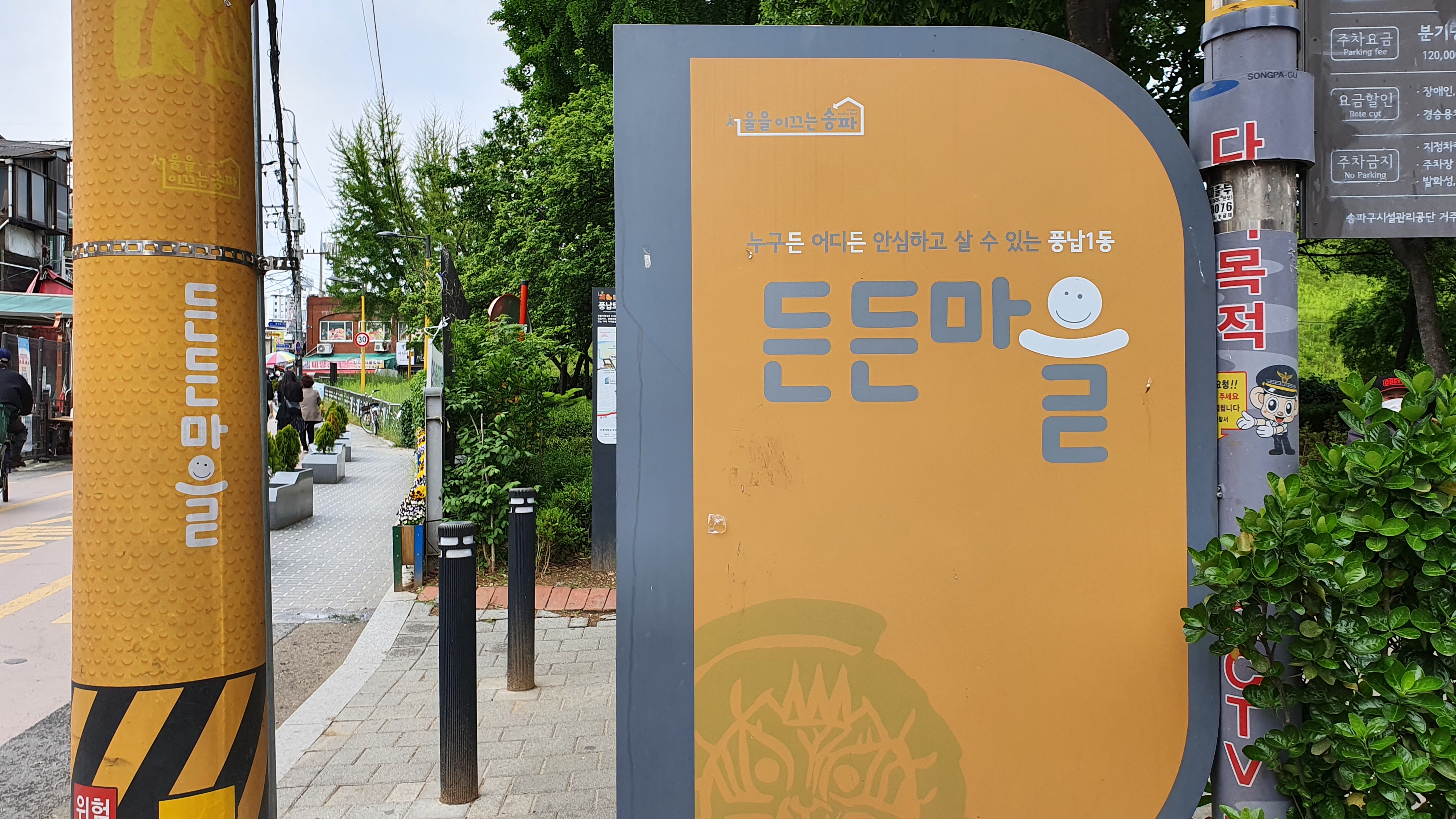 풍납1동 든든마을 코너에서 도깨비시장으로 진입하는 입구에 누구든 어디든 안심하고 살 수 있는 마을로 소개하는 안내판이 세워져고 있습니다.