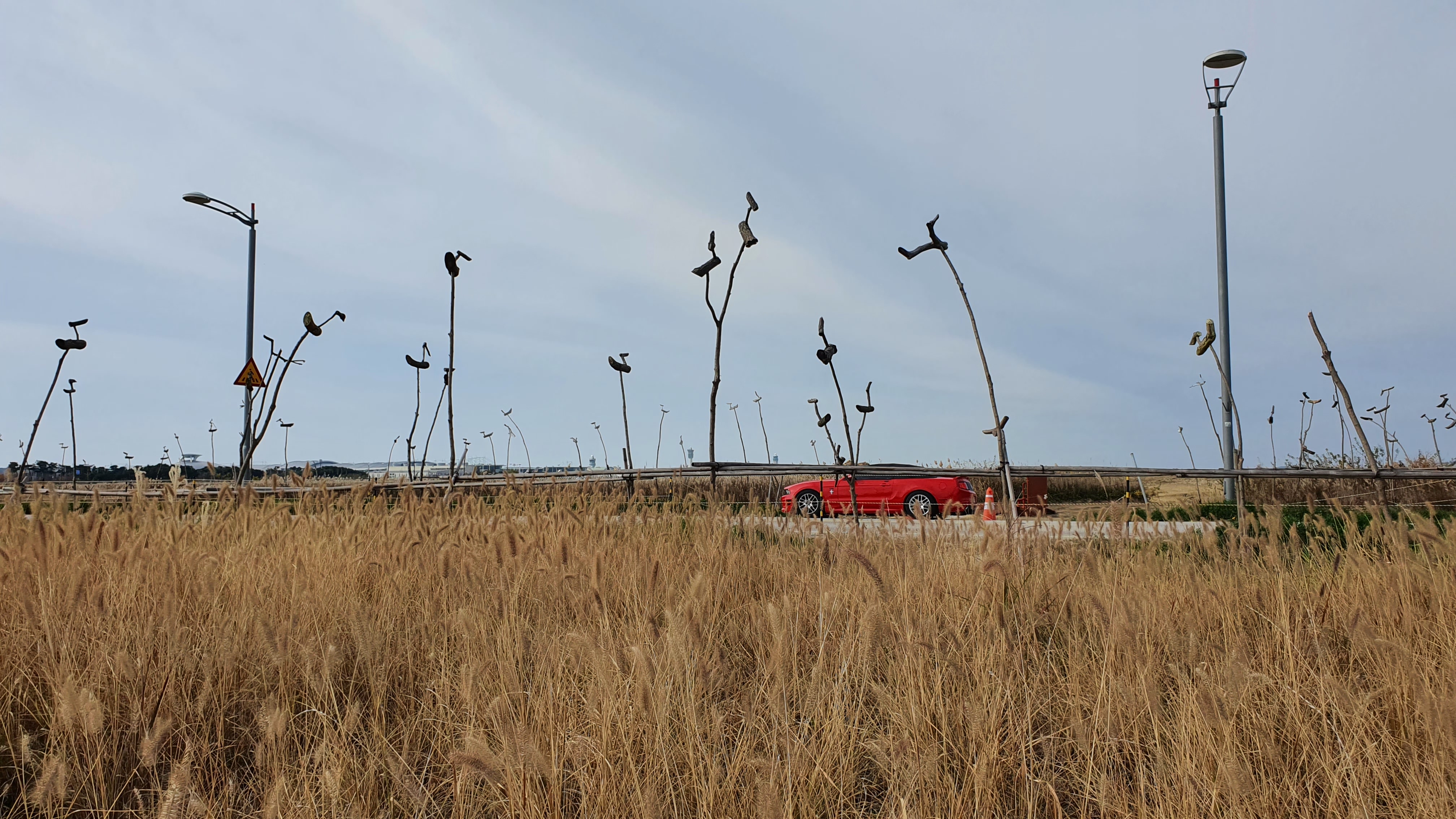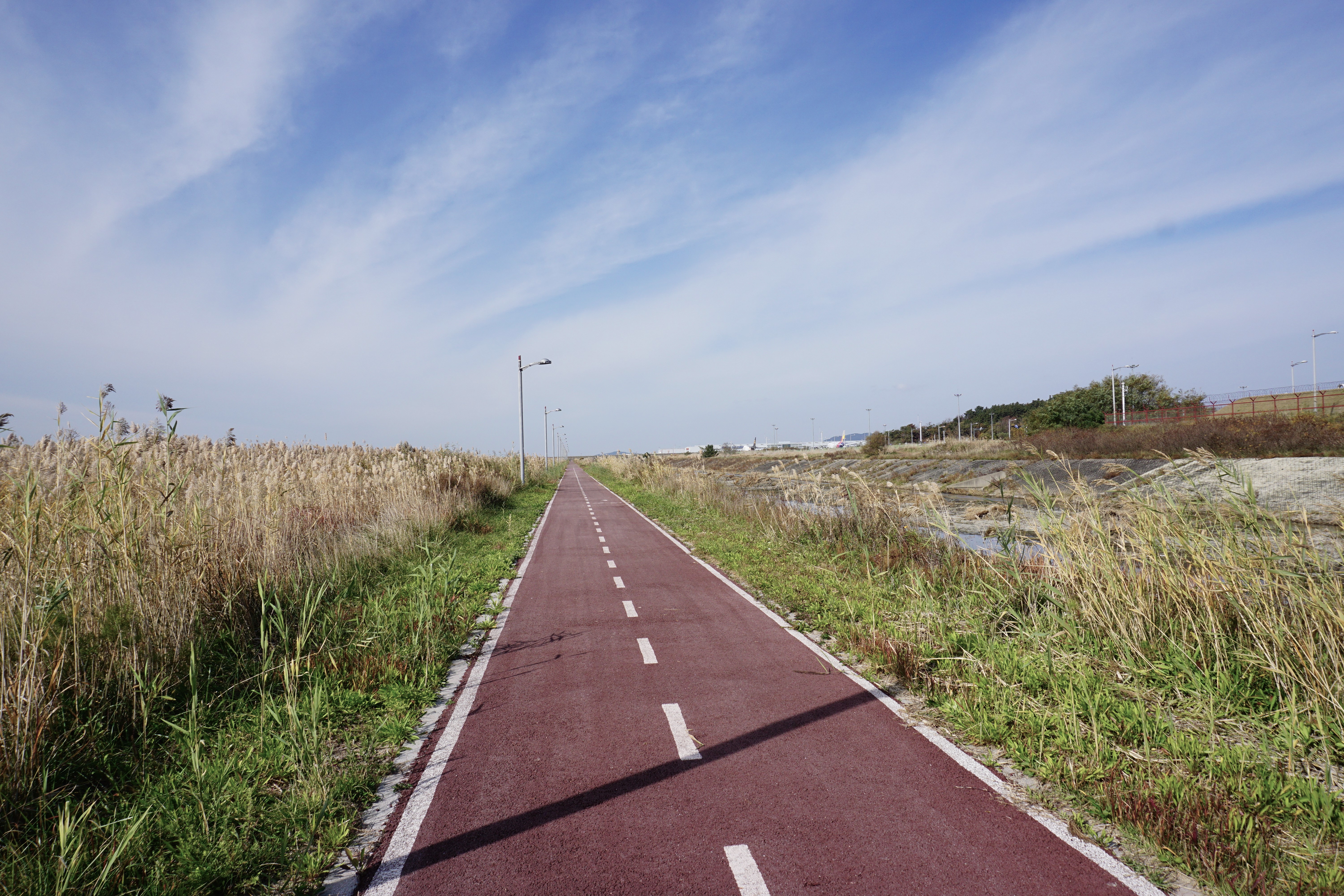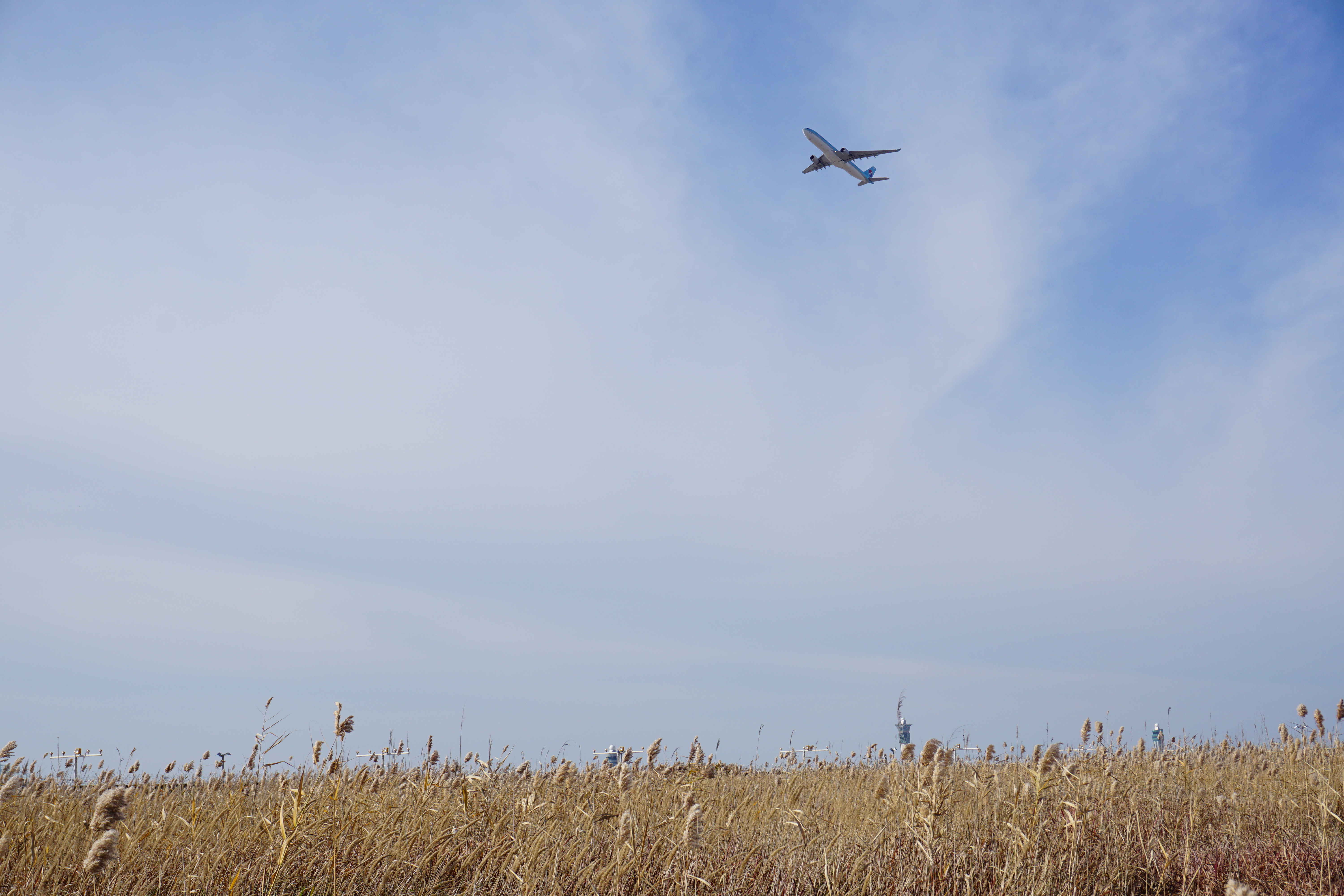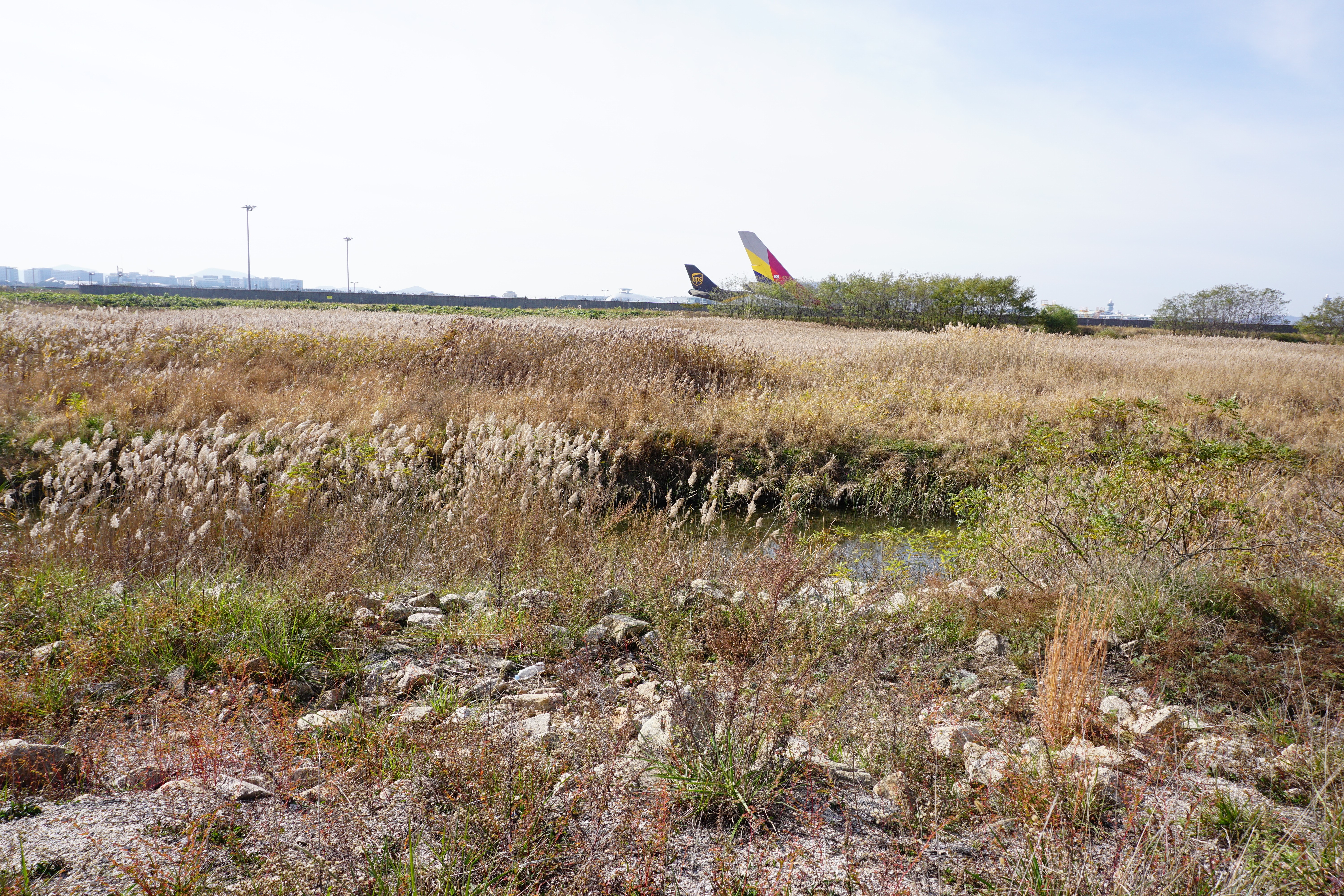 영종도 인천공항 하늘정원에 이번 가을에 화사했던 코스모스, 핑크뮬리는 다 지고, 지금은 드넓은 초원에 무성한 갈대꽃이 가을바람에 일렁이고 있습니다. 억새도 많이 섞여 하늘거리지민 갈대가 훨씬 많네요. 하얀 억새 갈대꽃에 햇살이 눈부시게 반사되고 있는 일요일(7) 오후. 자전거길 따라 달려 잠진도, 실미도, 무의도, 을왕리로 가다가 잠시 쉬어갔던 하늘정원, 오늘은 자전거 없이 홀가분하게 배낭하나 메고 화물청사역에서 내려 가뿐하게 걷기 출발입니다. 출발하면서 고개 들면 바로 비행기가 멀리 보이죠. 소리 없이 살포시 떠 오르기도 하고 내리는 초원 속으로 천천히 걸어가 갈대밭 한가운데 서면, 바람소리뿐, 적막, 멍 때리기입니다. 아무도 안 보이는, 끝없이 곧게 뻗은 자전거길 따라 가볍게 걷기 참 좋은 길입니다. 어쩌다 자전거 한두 대 소리 없이 지나가는, 호젓한 길 좋아하는 분들에겐 딱 어울리는 명품코스입니다. 비행기는 몇 분 간격으로 수시로 떠오르며 적막을 깨고 굉음을 내지만 곧 시야에서 멀어지면서 시끄럽지 않네요. 내리는 비행기는 엔진을 끈 듯 소리 없이 내려앉고 있었습니다.
