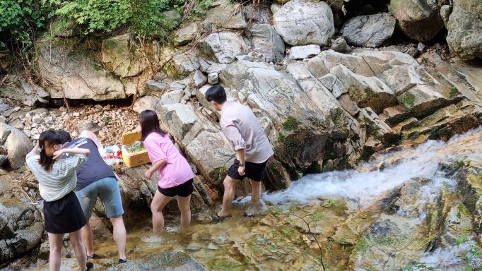 계곡은 넓지 않고 거의 일자형으로 산으로 올라가는데, 들어서자 마지 공기가 다르네요. 상큼합니다. 이 맛에 계곡을 찾는 것이죠. 여기저기에 작은 텐트 치고, 시원한 물소리에 피서를 즐기고 있는 분들이 많은데요. 큰 바위, 큰 폭포는 없지만, 물이 깊지 않아 이곳 개울에선 가붕개 잡는 게 재미인가 봅니다.