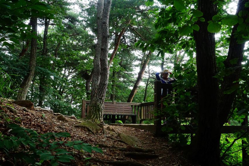 가파른 급경사 오르막길을 쉼 없이 한 800 여미쯤 오르면 산스장 쉼터
