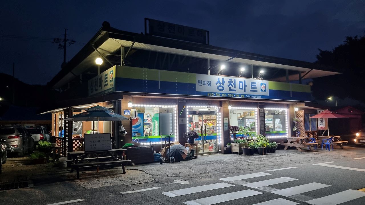 호명호수로 마을버스가 출발하는 상천마트 앞 도착(20:25), 왼쪽으로 돌아 어두운 길, 길안내 화살표 따라 굴다리 빠져나가면 상천역입니다.