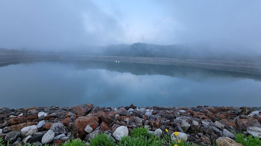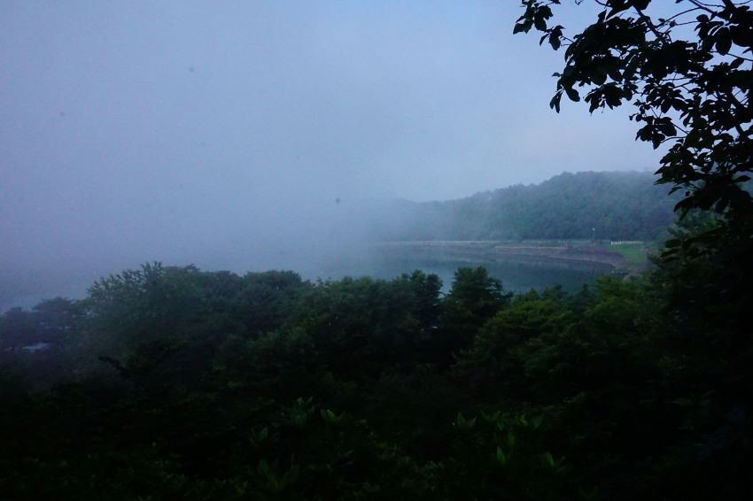 나무사이로 보이는 안개에 잠긴 호명호수(17:57)