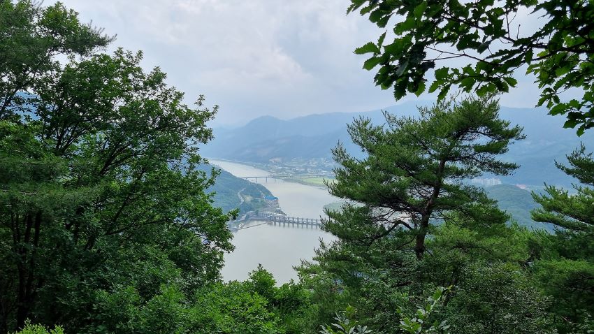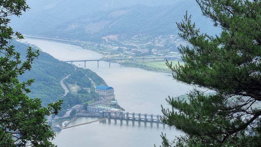 청평댐, 신청평대교, 강 건너 대성리로 가는 자전거길도 선명하죠.