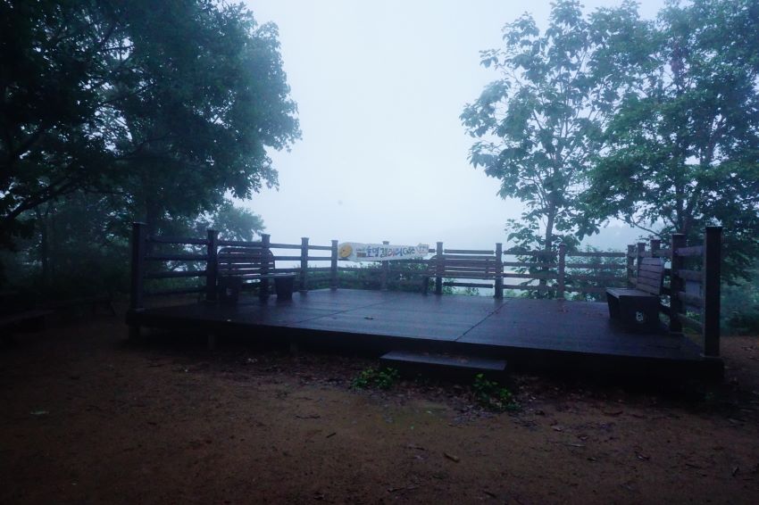 비가 줄기차게 내려 비 피할 곳도 없고 벤치는 흠뻑 젖어 앉아 쉴 곳도 없습니다. 그래도 서성이며 20여분이나 머물렀네요. 조망은 나무에 가려져 북한강이 조금 보일 텐데 그나마 안개에 잠겨, 사방을 둘러봐도 보이는 건 짙은 안개뿐.