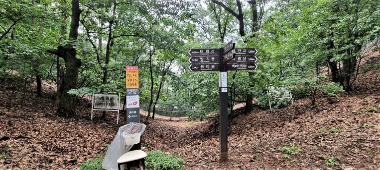 능선에 합류, 3.5km 만에 처음 보는 이정표, 길이 흐지부지한 계곡길을 긴가민가 하면서 걷게 하다니, 아주 불만스럽지만 쉼터가 있어 잠시 쉬어가기로 합니다. 바로 앞에는 군부대 철조망, 국가 지점번호 말뚝에 기대어 놓은 의자를 누군가 비닐로 덮어놨었네요. 벗겨져 있지만 젖지 않아 앉아 쉬어갑니다. 고맙죠. 그러면서 언짢은 마음이 슬쩍 풀렸습니다.