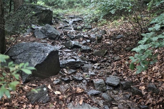 임도 끝, 이 지점에는 길안내 이정표가 있어야 할 자리인데 없습니다. 우측으로 나뭇가지 헤치며 흐지부지한 길을 찾아 코스에 접근 시도하는데, 장맛비로 길이 실종된 듯한데요. 길인지 계곡인지 질척한 바위 너덜 계곡길을 따라 올라갑니다. 지도 검색에 뜬 경로 따라가긴 가는데, 지도에 뜬 산길 믿고 가다가 완전 실종, 몇 번 고생한 적이 있어 간가 민가 하면서 올라갑니다. 바위들이 크지 않고 험하지는 않지만 모나고 젖어 있어 조심스럽습니다.