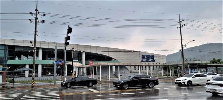 롯데아파트 앞, 버스 정류장에 지붕이 있는 큰 부스형 쉼터에서