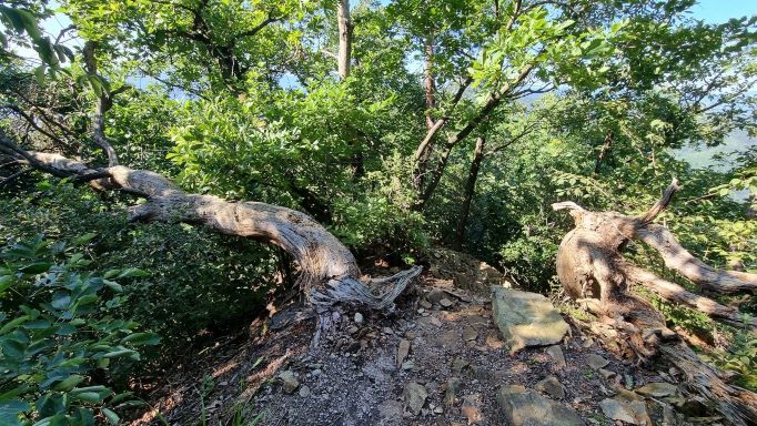 근처 쉼터에서 잠시 쉬어주고 다시 출발. 본격적인 오르막 능선길, 거칠고 허물어질 것 같은 오래된 계단길, 로프난간이 설치된 급경사 구간에 안 보이던 바윗돌도 나타나는 바윗 돌길, 숨찬 구간이 이어집니다.