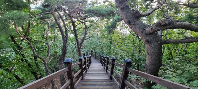하산길 시작 전망대에서 내려오는 600여 미터는 급경사에 험한 내리막 계단길이 이어집니다.