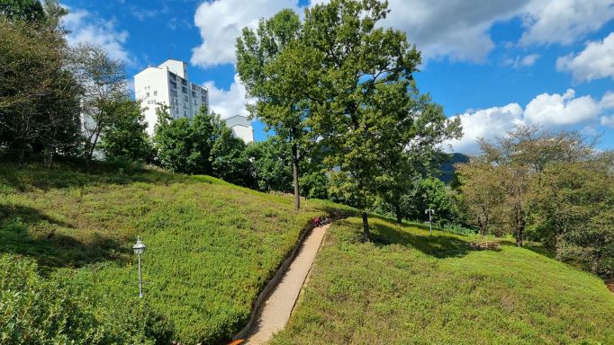 여뀌 풀꽃이 무성한 산길을 올라 노거수 단풍나무를 만나면 바로 만남의 광장, 넓고 넓은 쉼터입니다. 수리정이라는 현판이 붙은 정자도 있고, 운동기구들도 여기저기 설치되어 있고, 벤치도 네(4) 개나 놓여 있습니다. 여기서부터 정상까진 960 m, 깎아지른 급경사, 거의 절벽 같은 산비탈이 병풍처럼 둘러쳐져 있는 쉼터입니다. 여기서부터 슬기봉을 오르는데 가장 힘들고 험한 구간이 기다리고 있는 것이죠. 잠시 쉬면서 둘러보니 드넓은 쉼터에 수크령 몇 포기 섞여 있을 뿐 잡초만 무성하네요. 구절초, 쑥부쟁이 같은 가을꽃이 피어 있으면 멋질 쉼터일 텐데요. 잡초밭 한가운데는 물웅덩이도 있습니다. 매미나방 유충 방제용이라는 안내문이 꽂혀 있습니다. 방제용 농약 희석용으로 사용되나 보죠. 작은 물웅덩이인데 여기에도 오늘은 푸른 하늘 뭉게구름이 내려와 잠겨 있습니다.