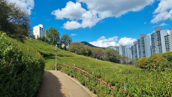 이기조 선생 묘비를 지나 야트막한 언덕길을 오르면 푸른 하늘 뭉게구름 아래 가을빛이 스며든 짙은 초록의 철쭉 동산, 꽃은 없어도 초록 초록 물결에 압도됩니다. 가을 초록, 그 아름다움의 재발견입니다. 영산홍, 자산홍, 홍 황철쭉이 봄에 온 동산에 피어나면 황홀하겠죠, 상상만 해도 설렙니다. 22만 본이 식재되었다는 안내문은 오래전 조성 당시였겠죠. 지금은 헤아릴 수 없습니다. 너무 밀집해 있어 발 디딜 틈 손 디밀 틈도 없습니다. 동산에 이리저리 나 있는 산책로를 벗어날 수가 없네요. 보성 녹차밭 풍경입니다.