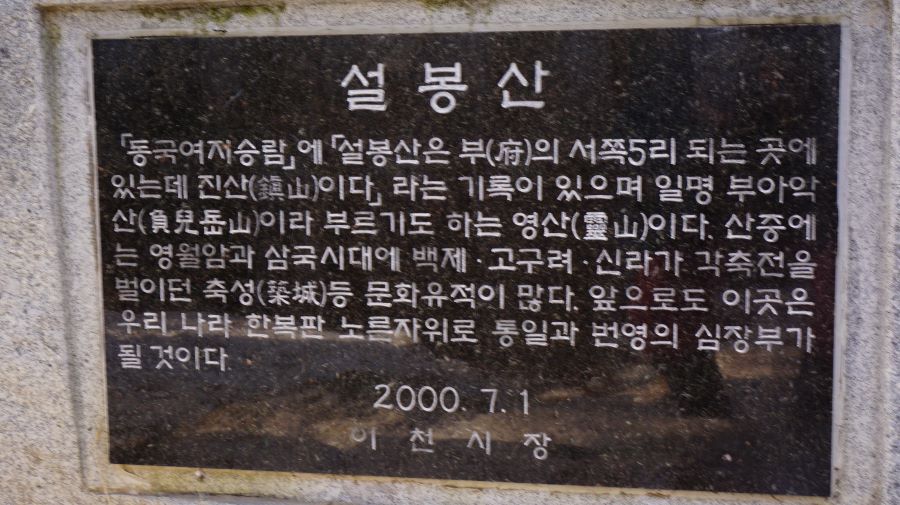 설봉산 안내문에도 이천시의 비전을 담았습니다. '이곳은 우리나라 한복판 노른자위로 통일과 번영의 심장부가 될 것이다'.