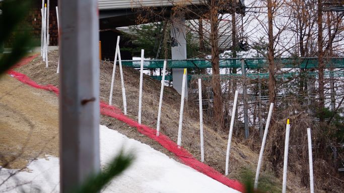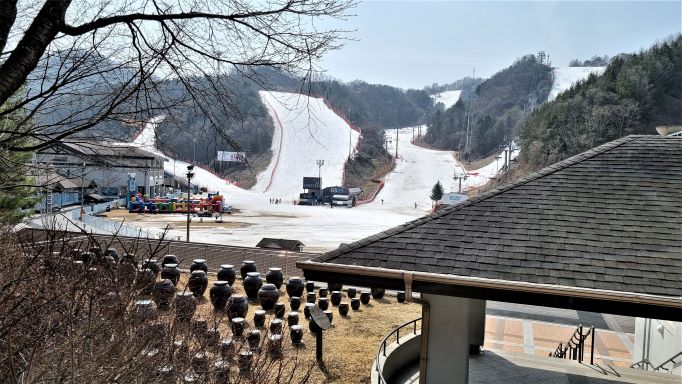 눈 덮인 하얀 슬로프를 봄날에 볼 줄은 의외입니다. 중급자 코스, 맨 우측은 상급자 코스.