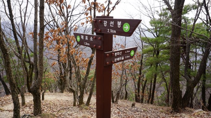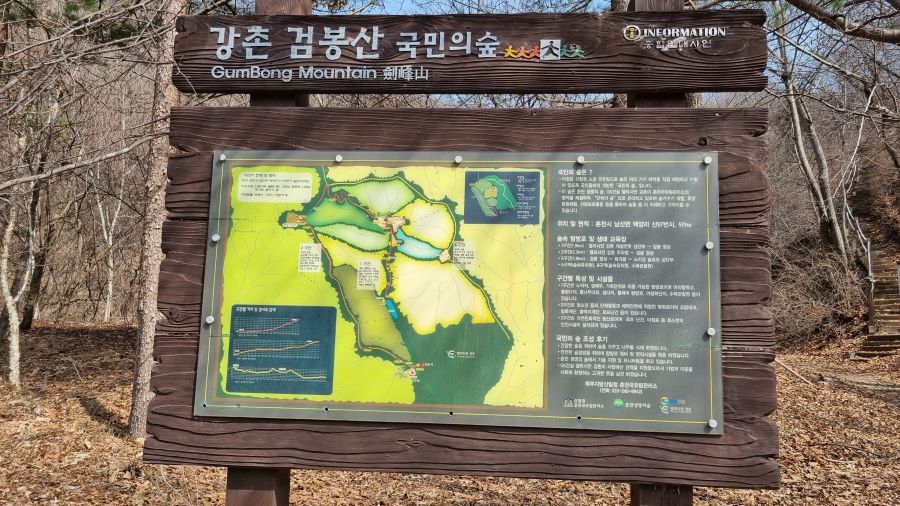 등산은 왼쪽 2코스 마운틴코스로, 하산은 우측에 3코스 포레스트코스로 내려왔습니다. 가운데 1코스 밸리코스에는 계곡 따라 오르면서 출렁다리도 있고 야생화 꽃단지도 지나가는 길, 그래서 1코스는 좀 더 기다려 꽃피는 봄날에 오르는 게 좋겠습니다.