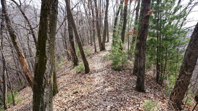 갈잎에 뒤덮인 좁은 능선길에는 유난히 굵직굵직한 굴참나무가 많네요.