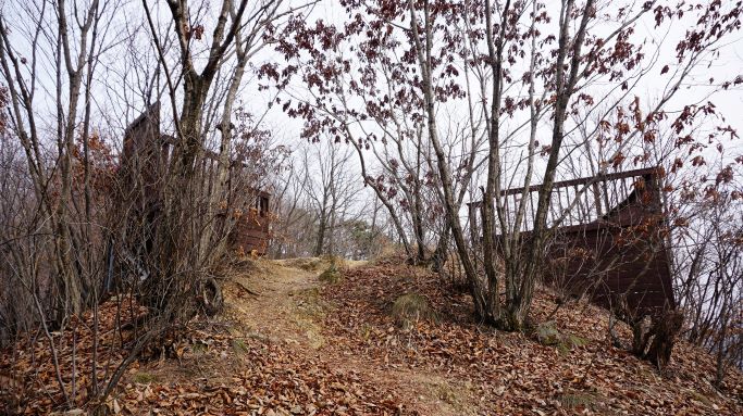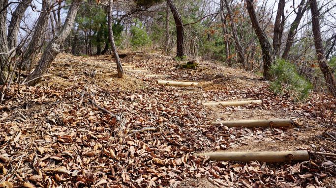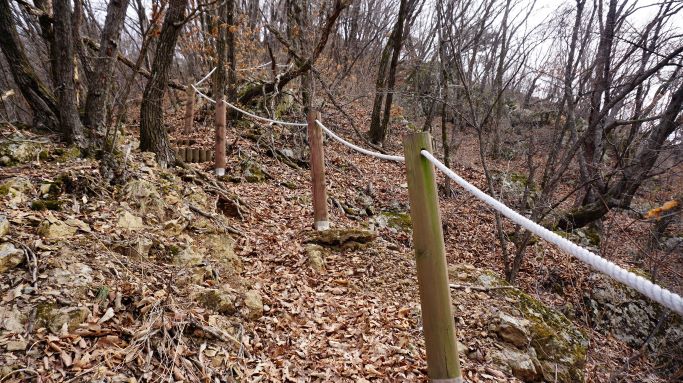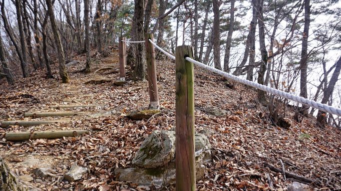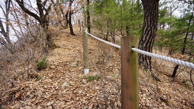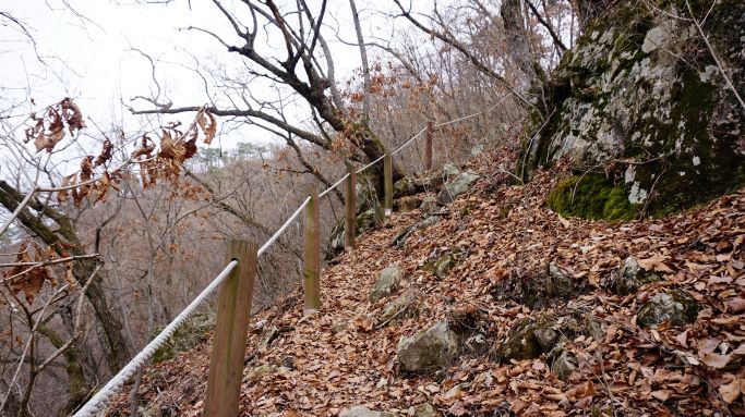 통나무계단 58개, 그런데 계단이 오래돼 낡고 썩고 해서 무너진 곳이 많은 데다 낙엽에 덮여 안 보이고 숨겨 있는 미끄러운 계단이 많네요. 350개도 넘겠는데요. 계단과 계단 사이 보폭이 너무 넓어 조심조심 밟고 올라야 합니다. 초반 오르막 500여 미터가 힘들게 하네요.