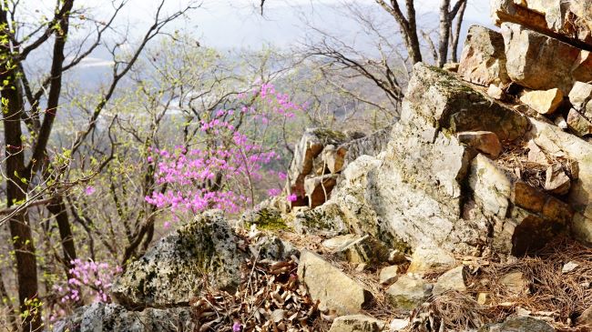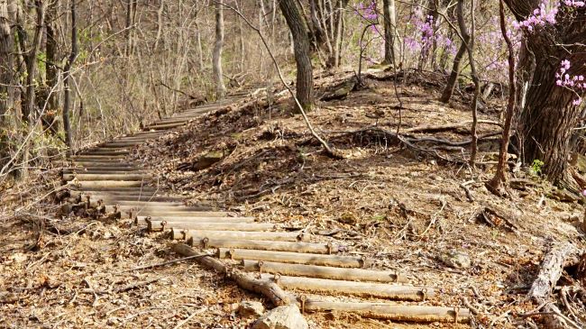 굴봉산역에서 1.2km 진행해 온 지점에 첫 번째 만나는 쉼터에서 배낭 내려놓고 잠시 쉬어갑니다. 정상까진 1.7km 남았네요. 쉬어 주고, 다시 출발하면 갈잎이 수북한 오솔길, 걷기 편한 완만한 오르막 길에 진달래가 곱게 피어 있습니다. 통나무 계단길 두 번 지나서 만나는 두 번째 쉼터는 패스하고 좁은 능선길 따라 계속 올라가다 내려다보니,