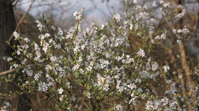 메마른 산길에 화사하게 피어 있는 앵두나무꽃입니다.