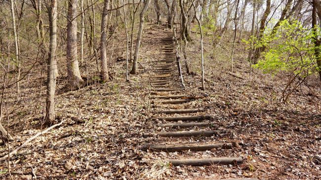 세 번째 쉼터 지나, 정상 전방 500여 미터 지점부터 급경사 오르막 시작, 200여 개의 통나무 계단을 오르면,