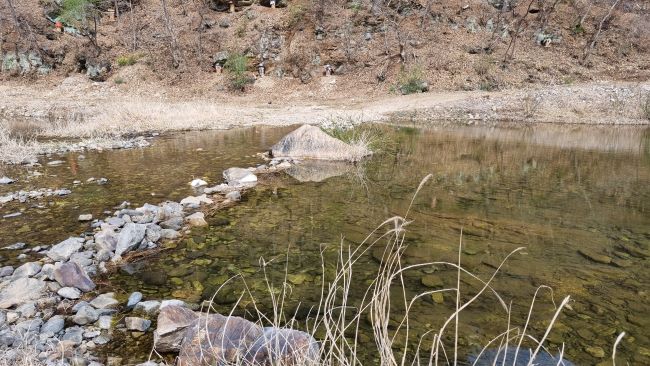 굴봉산역 1번 출구 나오면 앞에 등산로 안내판이 세워져 있습니다. 안내판 보고, 남산초등학교 서천분교 앞을 들머리로 해서 산행하기로 하고, 차로 따라 500여 미터쯤 내려가면 서천분교 정문입니다. 학교 앞 길가에 등산로 안내판이나 이정표가 있어야 할 자리인데 없네요. 길 건너에 보이는 산으로 농로 따라 들어가면 작지 않은 개울이 가로막고 있습니다. 물이 조금만 불어나도 잠겨버려 신발 벗고 건너가야 할 수도 있겠네요. 옛날 옛적 이야기에나 나오는 오지 산골마을의 개울을 건너는 모습이 떠올려집니다. 이곳에 들머리 틀림없는데 안내판도 없고 변변한 돌 징검다리조차 없네요. 오늘은 신발 안 벗고 조심해서 건너갈 수 있었습니다.