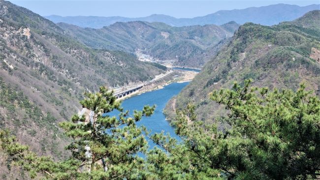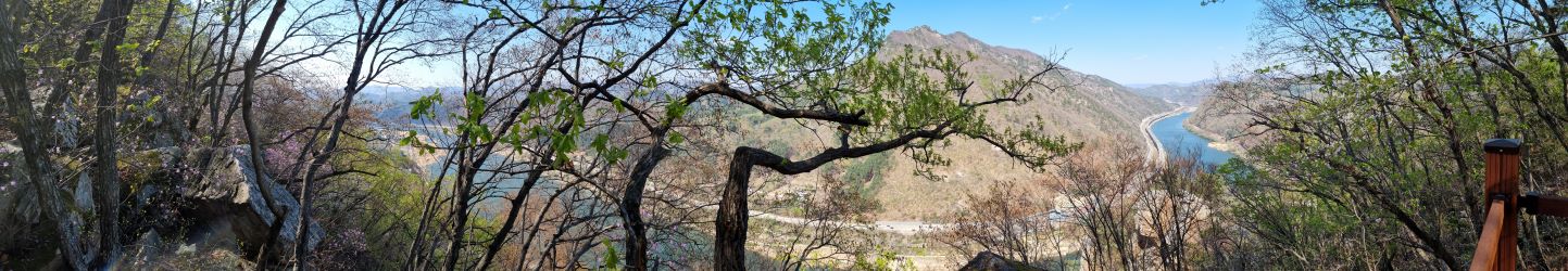 삼림욕장 전망대에서 바라본 파노라마뷰, 북한강이 삼악산을 감돌아 나가고 있습니다.