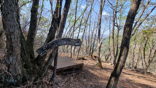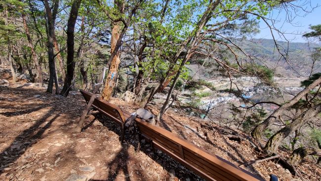 안전로프길에서 올라서니 벤치 두 개가 다정히 붙어 있는 쉼터, 배낭 내려놓고 잠시 쉬어갑니다.