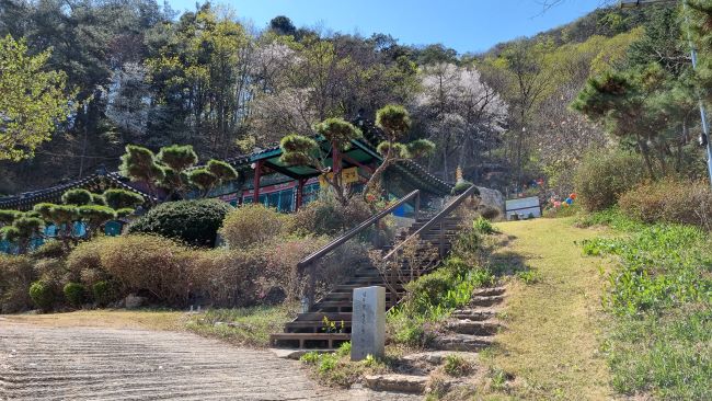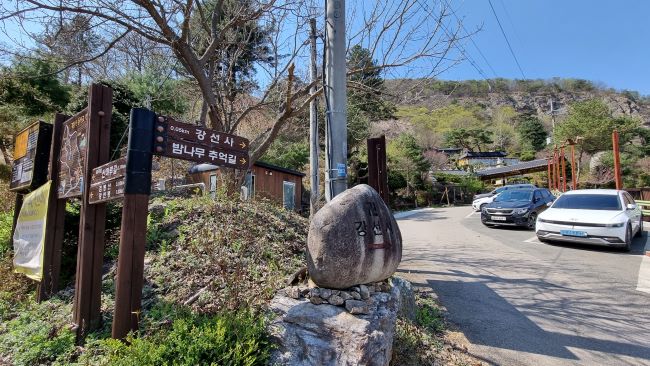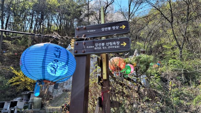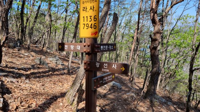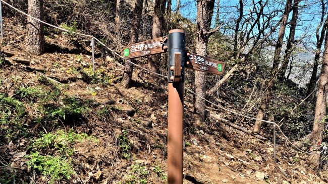강선사 앞입니다. 갈림길이죠. 오늘 올라간 코스는 우측으로 진행, 강선사 일주문을 통과 올라, 대웅전 우측으로 이어지는 아주 가파른 등산로입니다. 여기서 좌측으로 이어지는 등산로를 따라 오르는 코스는 지난번에 올라갔던 코스죠. 가파른 건 마찬가지이지만 북한강뷰에 기대가 컸는데 좀 아쉬운 코스였습니다. 세 번째 코스는 구곡폭포 주차장에서 문배마을 쪽으로 올라 검봉산 정상 지나 강선봉에 오르는 코스로, 가장 먼 코스이지만 코스는 가장 무난한 편이죠.