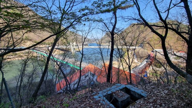 다 내려왔습니다. 아래 보이는 붉은 지붕이 옛 강촌역입니다.
