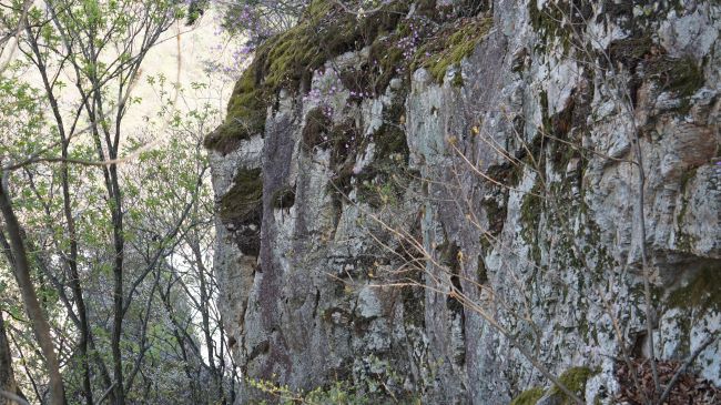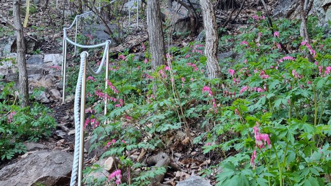 정상은 지난번에 다녀와 오늘은 패스, 큰 바위얼굴에서 옛 강촌역 쪽으로 내려왔습니다. 하산길은 금낭화 꽃길, 하지만 긴장된 급경사 내리막길입니다.