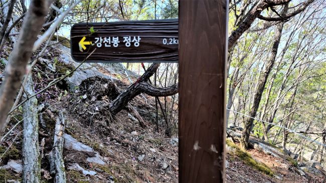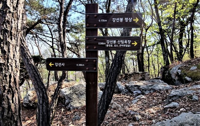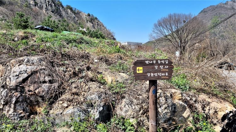 강선사 대웅전 옆으로 오르는 계단을 오르면 등산로 안내 이정표 세워져 있습니다. 거리표시(정상 530m)에 오류가 있어 보이지만 길은 외길입니다. 쉼터 정자가 하나 있지만 패스, 100미터쯤 직진하면, 다시 이정표(정상 1.2km)를 만나게 됩니다. '밤나무추억길'은 우측으로, 강선봉은 좌측으로,
