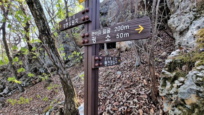 쉬어주고 다시 출발하여 200여 미터 지점에서 만나는 이정표에 통천문과 귀소가 멀지 않네요. 왼쪽 전망대 쪽으로 가도 되고 오른쪽 길로 가도 두 길은 서로 만나게 됩니다. 괜히 혼선을 주는 이정표입니다.