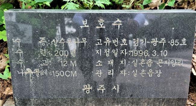 재실 옆에 수령 200년이 넘은 보호수, 산수유나무입니다.