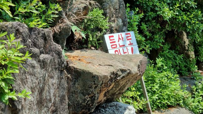 다가가 보니 바위에 가려졌던 '아님'이 보이네요. 절에서 써 놓은 등산로 아님이라는 안내판이었습니다.