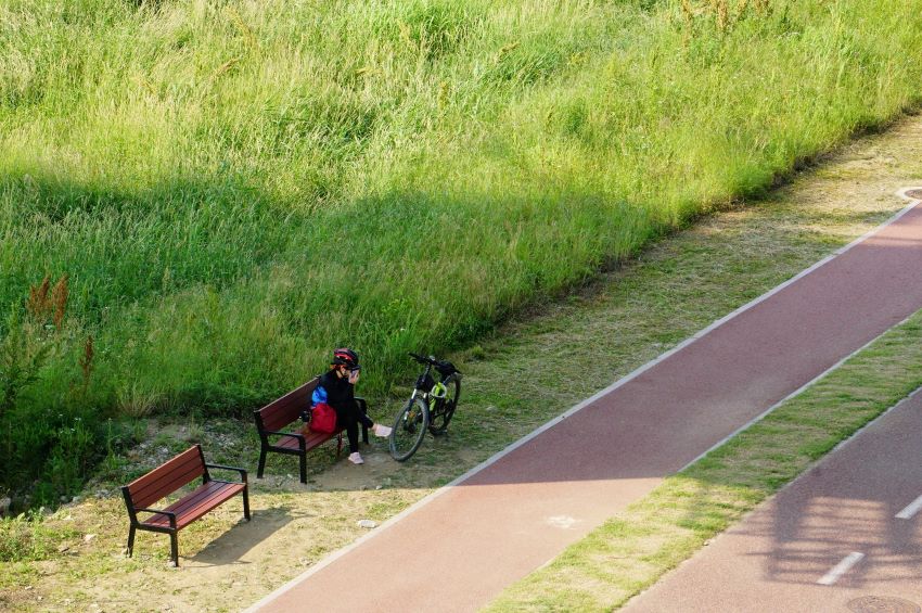 광주역으로 넘어가는 길, 보행교 위에서 내려다본 경안천 자전거길입니다.