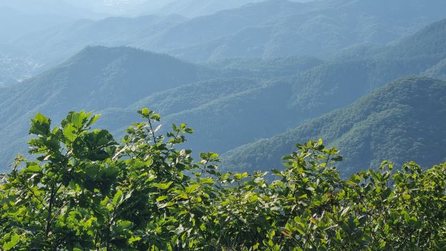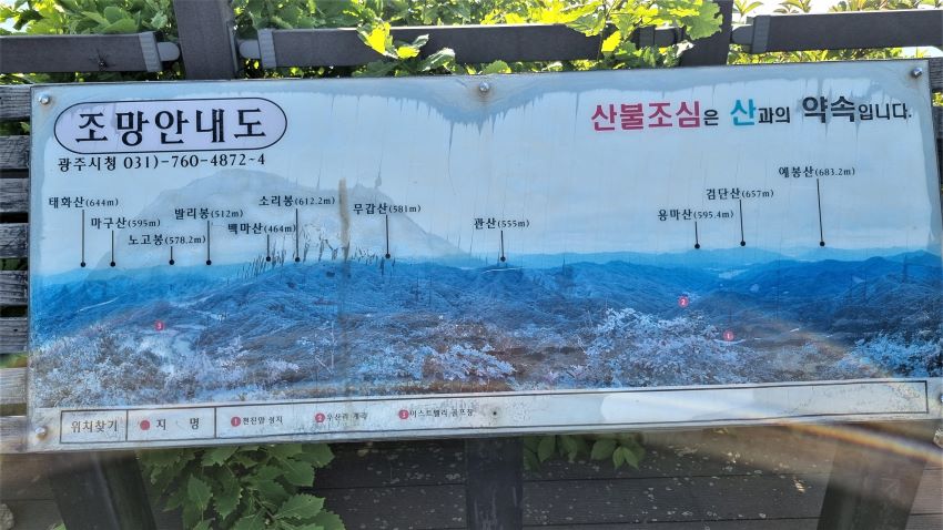 조망안내도에 바라보이는 산이름이 표시되어 있네요. 그중, 백마산, 무갑산, 용마산, 검단산, 예봉산엔 올라갔었지만 거기쯤인가 싶을 뿐 잘 모르겠습니다. 사방을 둘러보며 찍은 풍경은 모두 시원하게 이어지는 산너울, 산그리메입니다. 이런 막힘없는 조망이 앵자봉의 매력이네요.